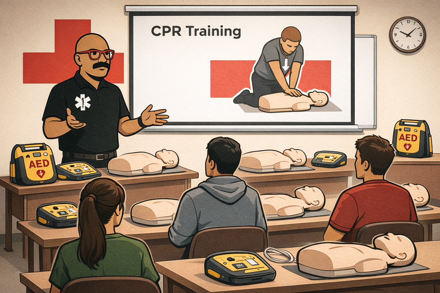 A traditional, in-person class led by an American Heart Association Instructor. Students learn through guided instruction, video-based lessons, hands-on practice, and skills testing during the class.