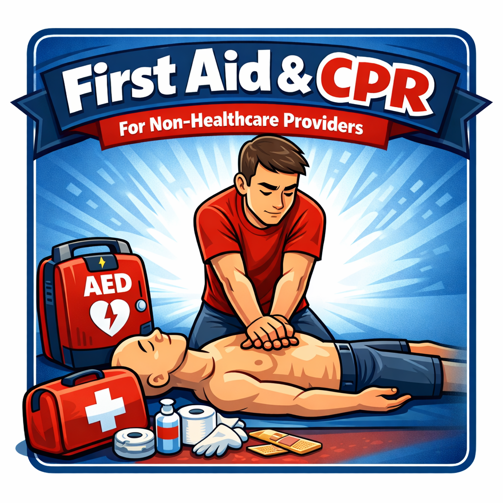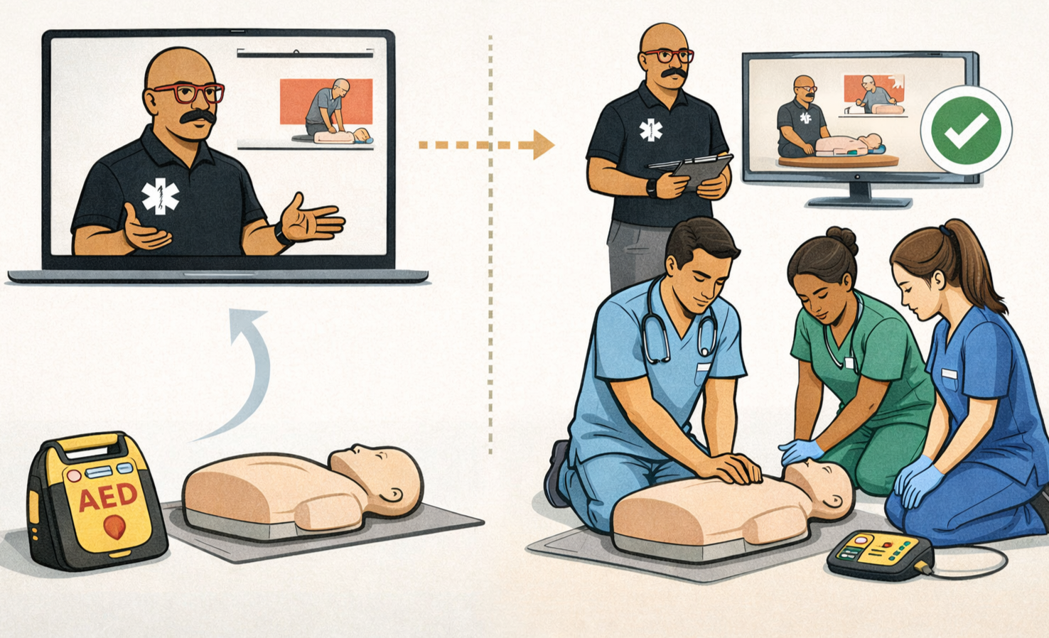 Combines self-paced online training with a required in-person skills session. Students complete the online portion on their own time, then attend a hands-on session to practice and demonstrate First Aid, CPR/AED, ACLS, or PALS skills.